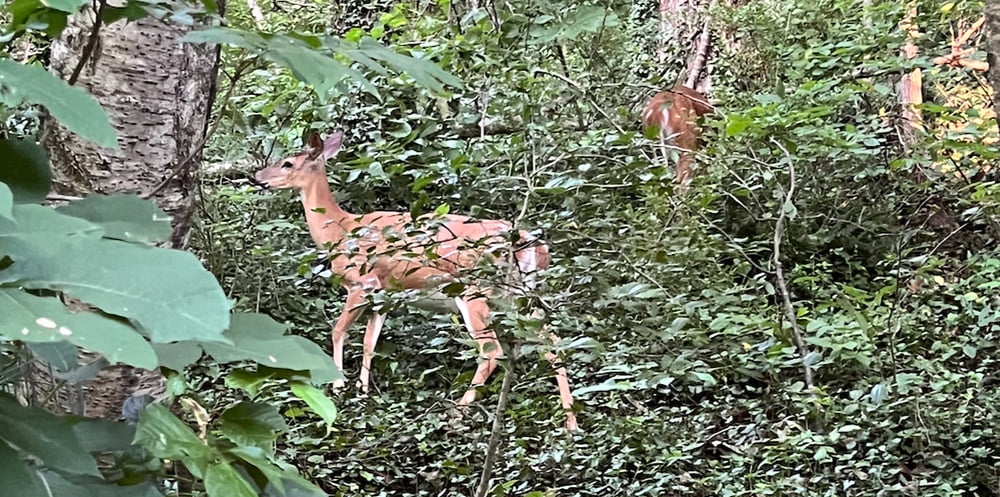 I have no doubt had I not been there that she would have given chase, but as the GSD proclivity is to listen and follow instructions, she quickly shifted into watching intently and quietly. Together the three of us peered through the forest and watched the deer eating peacefully.