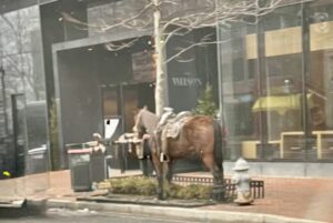 Last week in downtown Bethesda outside a coffee shop there was a horse tied up. Not a sculpture, but a real horse, reins slack, calmly standing while the weekday crowd streamed past with laptops and lattes in hand.